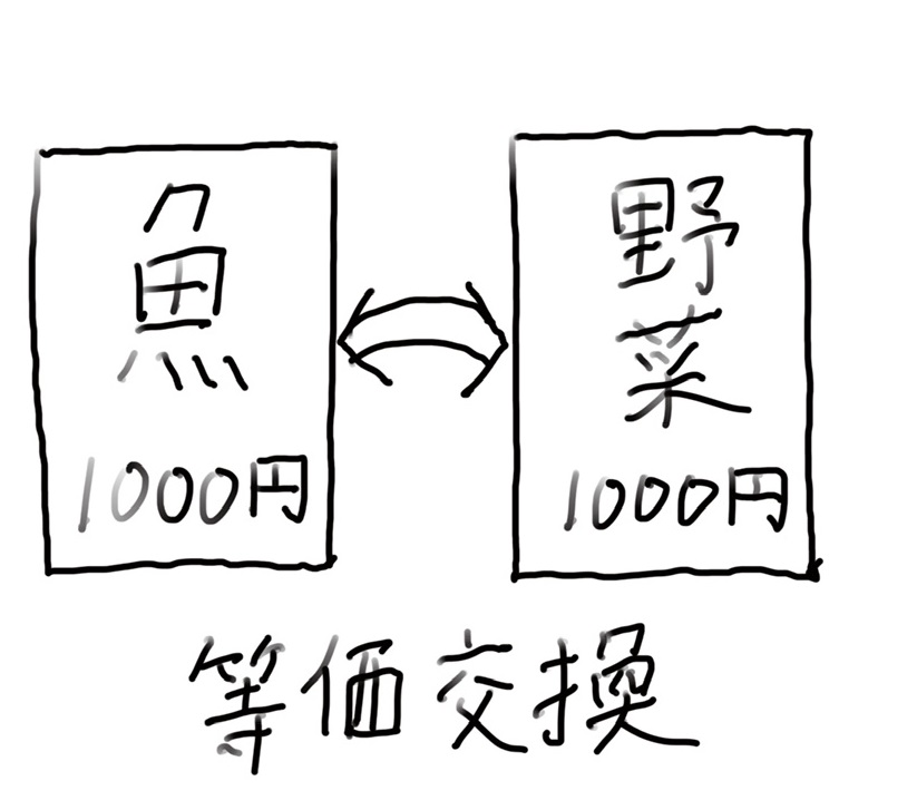 どれだけの魚と、どれだけの野菜が同価値なのかは難しい所ですが、それを整理していくために生まれたのが通貨であり、長い経済活動の中で徐々に整理されていき、今でも世間の情勢に合わせて少しずつ等価になるように変動しているものなのだと解釈しています。